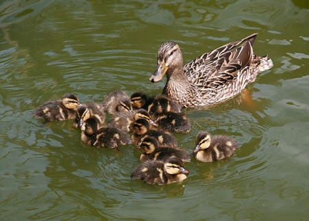 Wild ducklings, like these baby Mallard ducks, are in fact typically only partly yellow:
