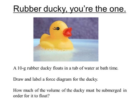 Rubber ducky, you’re the one. A 10-g rubber ducky floats in a tub of water at bath time. Draw and label a force diagram for the ducky etc…