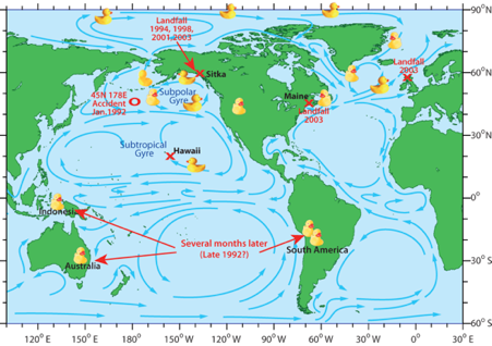 As the toys began to wash up on beaches years later, their appearances seemed at first random. Ducks turned up in Alaska, then along the west coast of North America, and eventually in the North Atlantic and even near the Arctic. What emerged, however, was a visible trace of ocean currents operating over long timescales. The toys drifted with surface currents, were caught in gyres, and in some cases frozen into sea ice before being released again years later. Their slow dispersal made concrete what is otherwise abstract: the oceans are not static bodies of water, but dynamic systems with structure and flow.