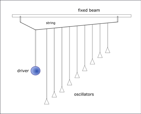 Barton’s pendulum consists of several pendulums of slightly different lengths suspended from a common horizontal support. When the support is driven with a periodic motion, energy is transferred through it to all the pendulums, but only one (or a small group) responds strongly. That pendulum is the one whose natural frequency matches the driving frequency of the support. The others move only weakly. It’s set up as follows;