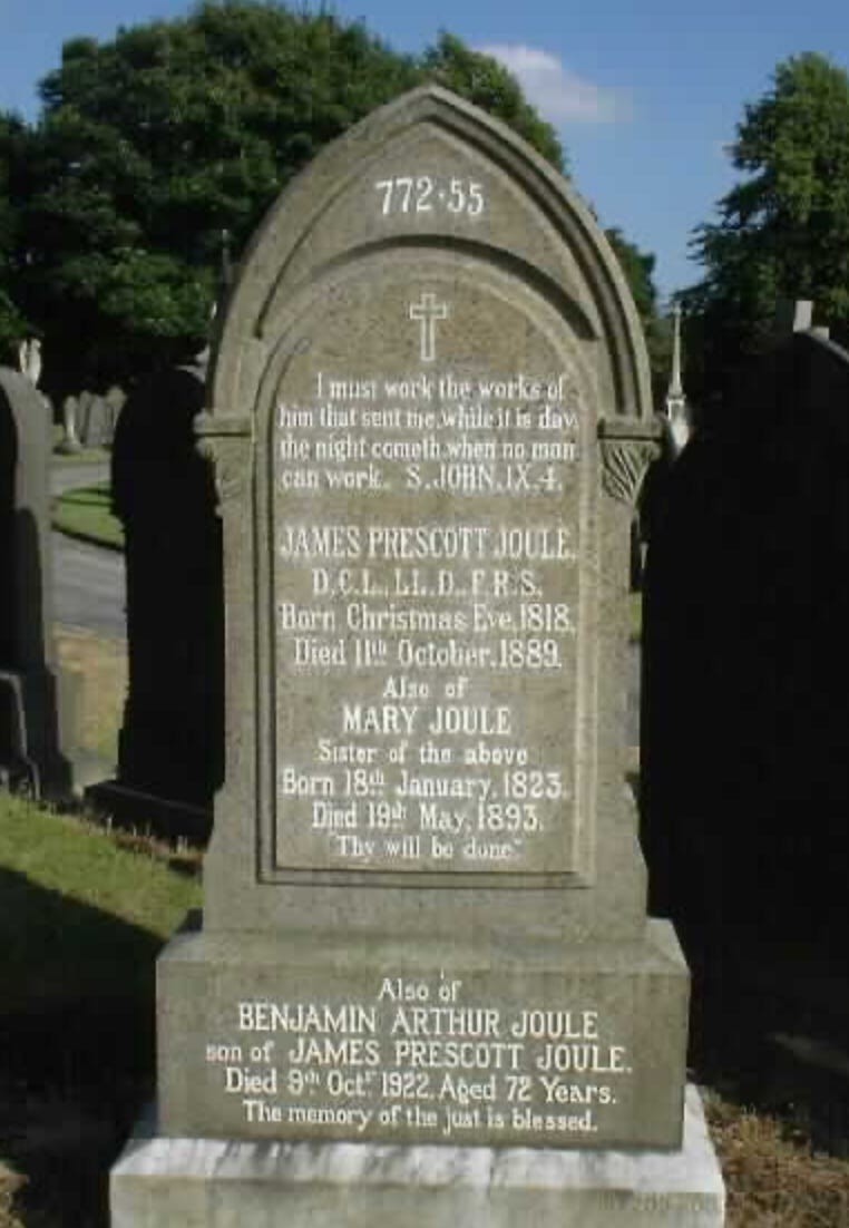 His gravestone, in Sale, Greater Manchester, has the number 772.55 engraved on it, the magnitude of work required to heat a pound of water by one degree in foot-pounds.