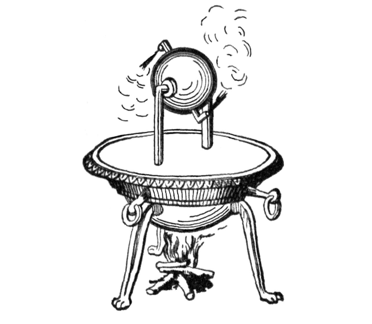 Aeolipilae are hollow brazen vessels, which have an opening or mouth of small size, by means of which they can be filled with water. Prior to the water being heated over the fire, but little wind is emitted. As soon, however, as the water begins to boil, a violent wind issues forth.[6]