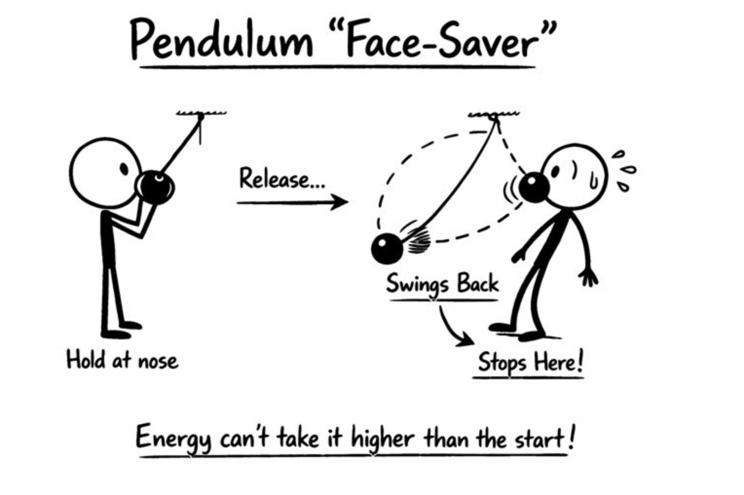 The drama comes from certainty: you are confident it will not hit you. That confidence rests entirely on energy conservation. The gravitational potential energy the pendulum starts with is all it will ever have. Some is lost to air resistance and sound, but none is gained. The pendulum cannot rise higher than its starting point, and so your face remains intact.